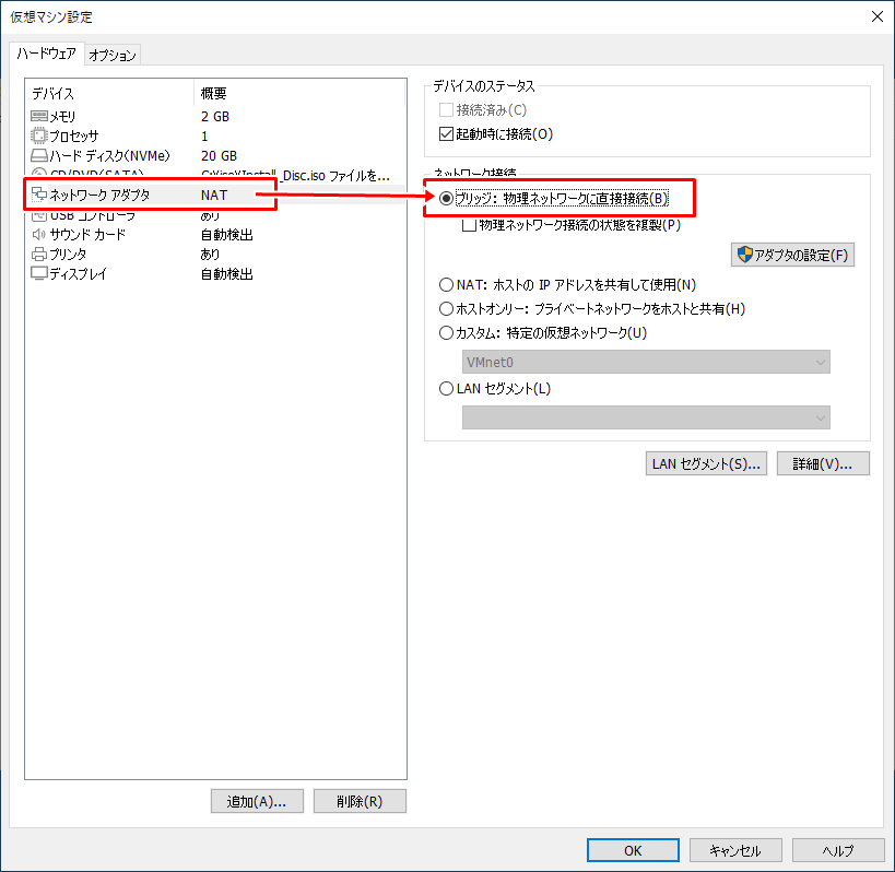 続いて、[ネットワークアダプタ]の中の[ブリッジ]にチェックを入れます。